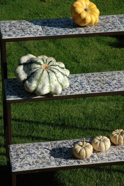De Barok style kenmerkt zich voornamelijk uit ingewikkelde patronen en tweezijdige symmetrie. Bovendien betekent het woord Barok onregelmatig gevormde parel . De uitvoering van deze print in blauw witte met zijn sierlijke krullen voegt veel sfeer toe. Deze etagère voegt niet alleen veel sfeer toe, maar is ook zonder bloemen of planten een prachtig tuinaccessoire. De drie treden bieden voldoende ruimte om van bijvoorbeeld een kale muur een groene oase te scheppen. Een echte blikvanger voor ieder balkon.