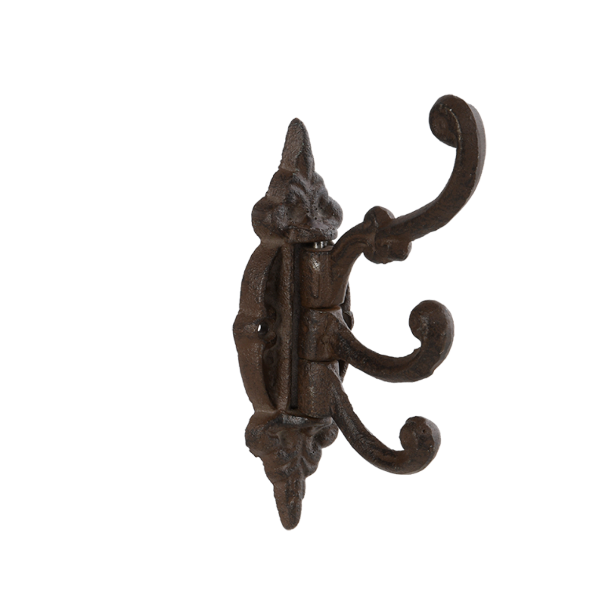 Op de drie verschillende lengtes van de haken die ook nog individueel te stellen zijn, kan van alles opgehangen worden. Deze decoratief gietijzeren draaibare haak is met de hand gegoten volgens eeuwenoud vakmanschap en traditie.