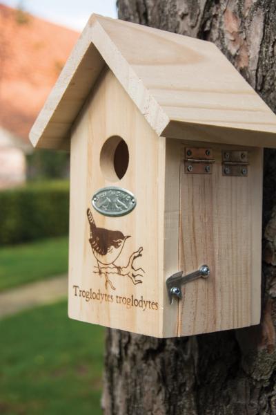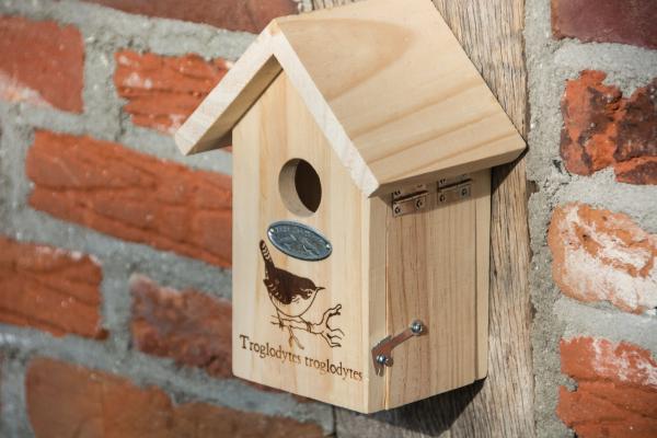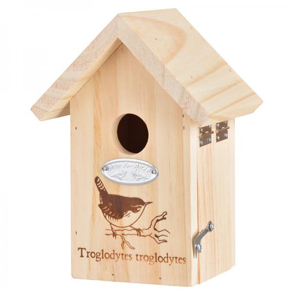 Het ingebrande silhouet en de Latijnse naam geven al aan dat deze nestkast voor de Winterkoning bedoelt is. Hij biedt een goede plek om in te nesten en om populaties van deze vogelsoort te behouden of weer terug te krijgen in een gebied. In de winter bewijst de nestkast vaak een goede dienst voor de vogels om te schuilen tegen het slechte weer. Plaats de nestkast aan een boom of muur, op een hoogte tot max. 2 meter, op een goed verborgen plek tussen dicht struikgewas of klimopplanten, op een rustige en enigszins beschutte plaats, dus niet pal in de zon of op de regenzijde, met een vrije aanvliegroute voor de vogel. Hang i.v.m. het territorium van de vogels de nestkast minimaal 10 meter weg van nestkasten die voor eenzelfde soort vogel bedoeld is en minimaal 3 meter weg van voederhuizen. Het najaar is de beste tijd om de nestkast schoon te maken. • sleutelgatopening • deur aan de zijkant • 30 mm diameter vliegopening • geschikt voor de Winterkoning