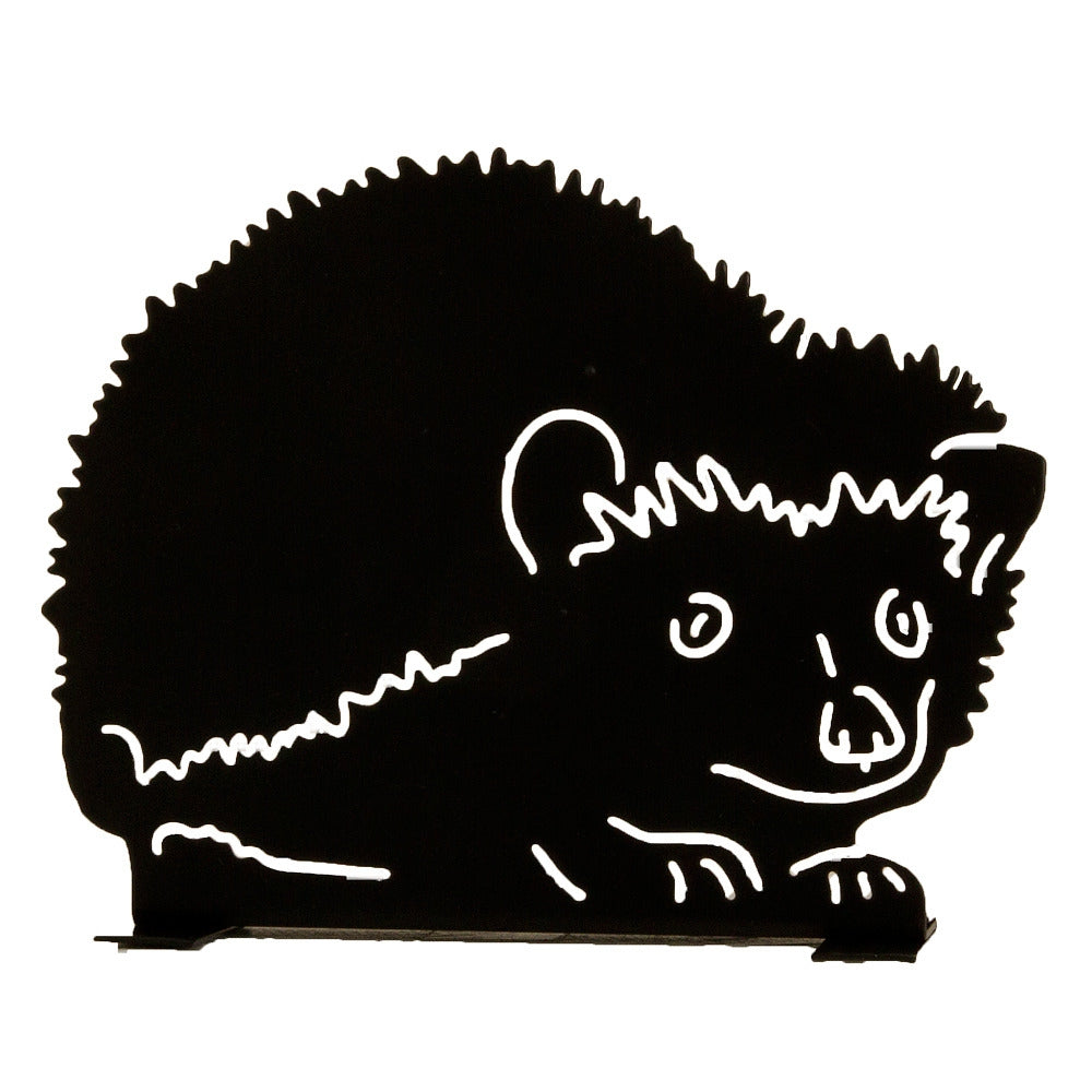 Een egel is een welkome gast in de tuin. De egel doet een winterslaap in de winter door zich in te graven in een berg compost, bladeren of takjes. Als hij wakker wordt heeft hij honger, u kunt hem dan voeren met kattevoer of hondenvoer. Wildlife Garden egel in zwart metaal Deze tuindecoratie in metaal gemaakt voor gebruik buiten laat de contouren van een egel zien. Hij kan het hele jaar buiten staan ter vermaak van een ieder die voorbij komten van egels houdt. De egel kan in de grond geplaats worden maar kan ook binnen gebruikt worden; bijvoorbeeld op een boekenplank.