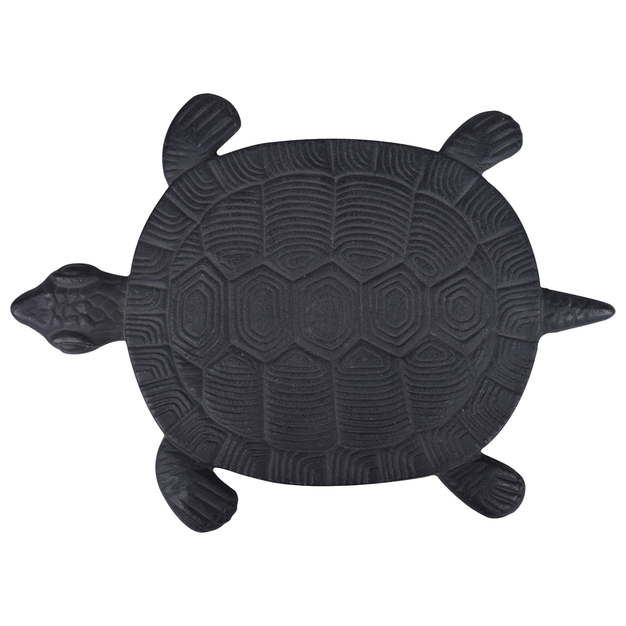 Originele zwarte gietijzeren tegel in de vorm van een schildpad. Leuk om als staptegel in de tuin te gebruiken.