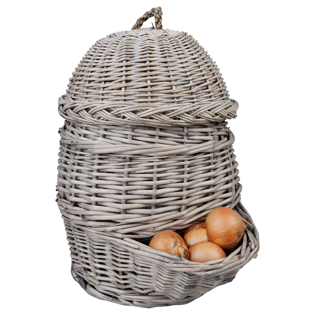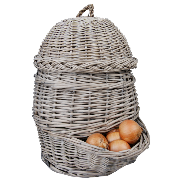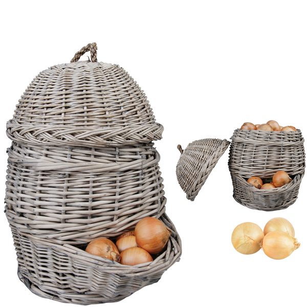 Grootmoeder wist het vroeger al: uien bewaar je het beste op een donkere plek, die tegelijkertijd goed geventileerd is. Met deze authentieke en decoratieve mand kunnen uien ideaal in de keuken, berging of kelder worden bewaard met weinig kans op uitlopers. Dankzij de open structuur wordt de oogst goed geventileerd en blijft het voor langere tijd vers. Door de uitstekende opening komt altijd de oudste voorraad als eerste uit de mand. De verse oogst dient men boven in de mand te plaatsen door het afnemen van de deksel. Naast uien, kunnen in deze mand bijvoorbeeld ook appels en aardappelen bewaard worden.