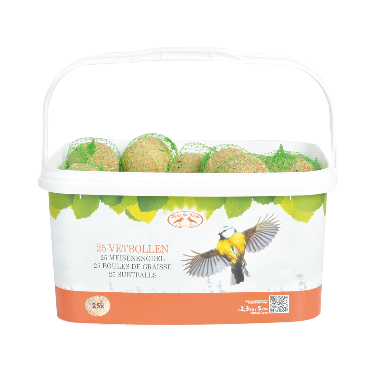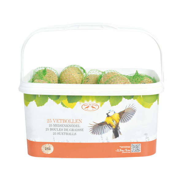 Het vogelvoer van Esschert Design is niet alleen hoogwaardig van kwaliteit, maar ook de verpakking heeft een frisse en krachtige uitstraling en biedt een toegevoegde waarde. Deze vetbollen zijn bijzonder voedzaam en voorzien van alle benodigde proteïnen en vitaminen voor allerlei soorten tuinvogels. Door de achteruitgang in de leefomgeving wordt het voor vogels moeilijker om zelf aan de dagelijkse kost te komen. Met dit zorgvuldig geselecteerde en aanvullende voer worden de vogels toch in hun dagelijkse behoefte voorzien. Vetbollen zitten bovendien boordevol eiwitten en oliën, en bieden zo vogels een calorierijke voeding aan vol energie. De ingrediënten van deze vetbollen zijn zo samengesteld dat ze de hele winter door aan vogels gevoerd kunnen worden. • set van 25 vetbollen • verpakt in rechthoekige emmer • hersluitbaar