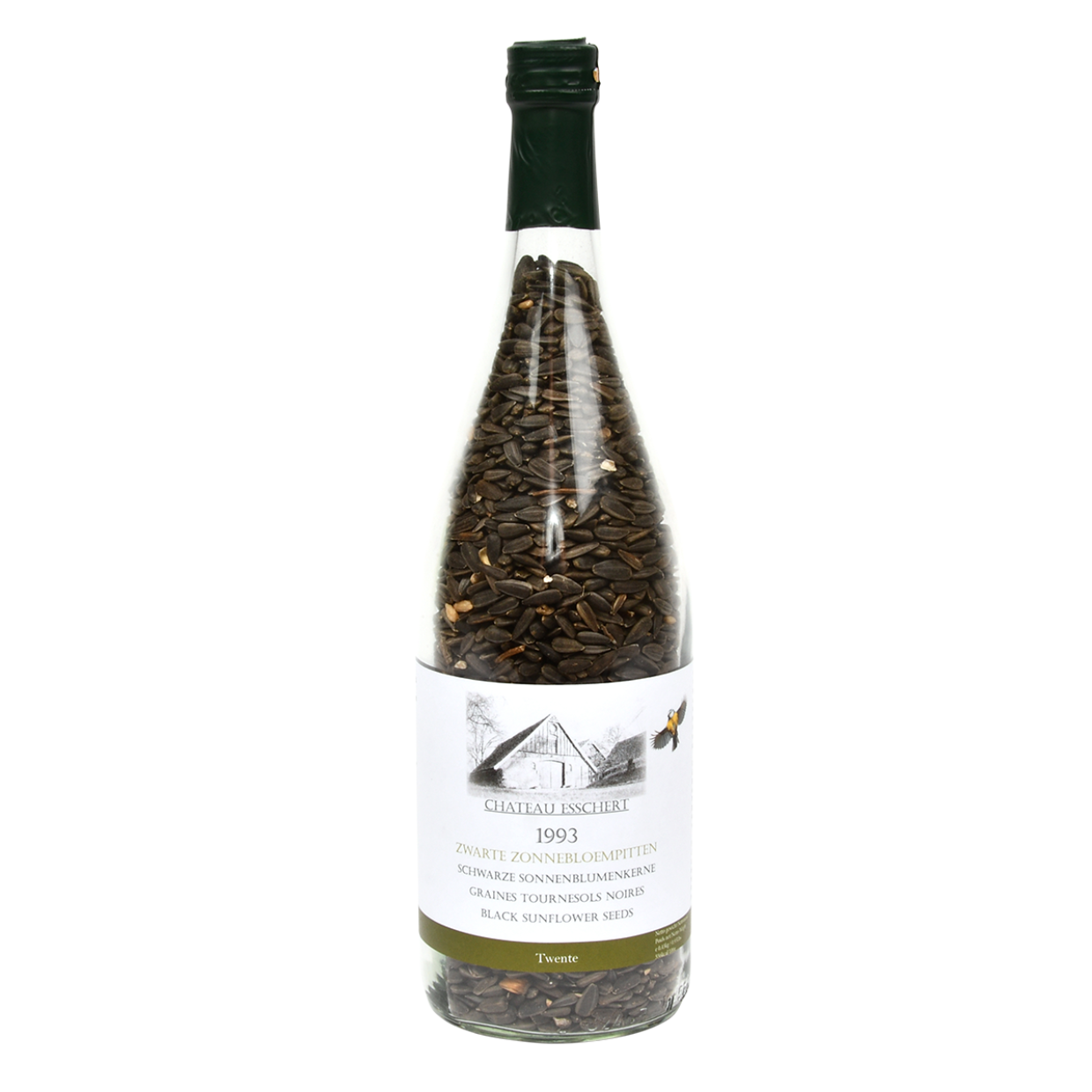 Lok vogels naar de tuin met deze wijnfles gevuld met zwarte zonnebloempitten. De wijnfles past in de wijnfleshouder FB478. fles gevuld met zwarte zonnebloempitten geschikt voor verschillende soorten vogels het perfecte cadeau voor vogelliefhebbers geschikt voor wijnfleshouder FB478